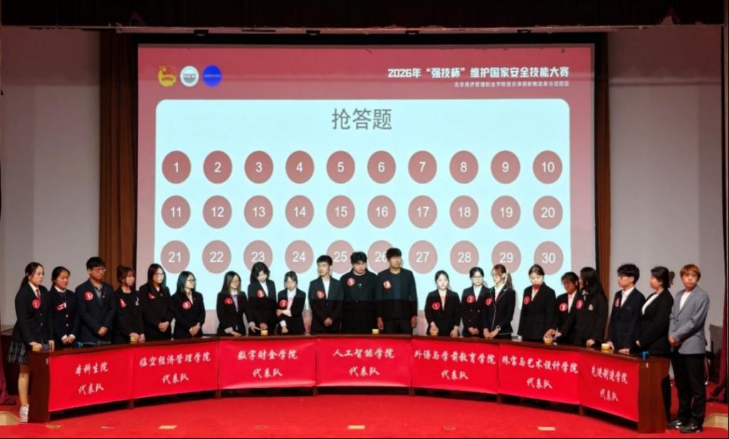 大赛设置国家安全教学成果展示与知识竞赛决赛两大环节。活动伊始,校话剧社带来国安主题话剧《平安第一课》,节目紧扣国家安全主旨,节奏紧凑、内容鲜活,兼具教育意义与艺术观赏性,生动诠释了国家安全的重要内涵。随后,国家安全知识竞赛决赛正式拉开帷幕,经过前期校内选拔赛的严格筛选,全校7支优秀代表队晋级决赛,每支队伍由3名选手组成,同台展开激烈比拼。竞赛分为必答题、抢答题两个环节,题目覆盖总体国家安全观、各领域国家安全核心知识等内容,全面考验选手的知识储备与临场应变能力。赛场上,各代表队选手沉着冷静、踊跃作答、默契配合,充分展现了北京经管院学子扎实的国家安全素养与昂扬的精神风貌。