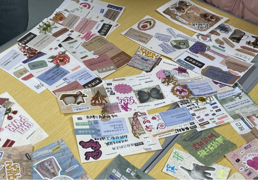 昌平校区活动围绕“自我探索”展开,依次设置了拼贴诗介绍、破冰交流、自我探索冥想、拼贴创作及作品分享等环节。初识拼贴诗:活动带领者介绍了拼贴诗的形式,无需从零写作,只需剪裁、组合现成素材,创作属于自己的诗。破冰交流:同学们简短分享了参与活动的心情,在轻松氛围中建立起温和的信任与连接。自我探索冥想:通过呼吸放松与内在觉察,大家逐步从外在角色回到自身体验,在安全、放松的氛围中开展自我表达。拼贴创作:同学们从丰富的素材中自由挑选、剪裁、组合,逐渐拼贴出属于自己的“诗”。有人用自然元素表达内心的渴望与安静;有人用破碎的结构呈现矛盾与拉扯;也有人拼贴出充满力量的词语,像在对自己说鼓励的话。很多人进入沉浸状态,情绪与体验通过手的动作自然流动出来。作品分享:大家围坐分享创作思路与感受,在倾听与反馈中增进对自我的理解,也获得了支持与共鸣。这正是表达性艺术的核心,让无法言说的部分,被看见、被承载。