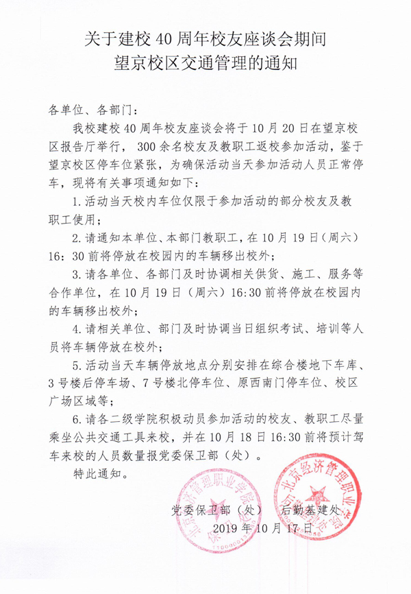 关于建校40周年校友座谈会期间望京校区交通管理的通知